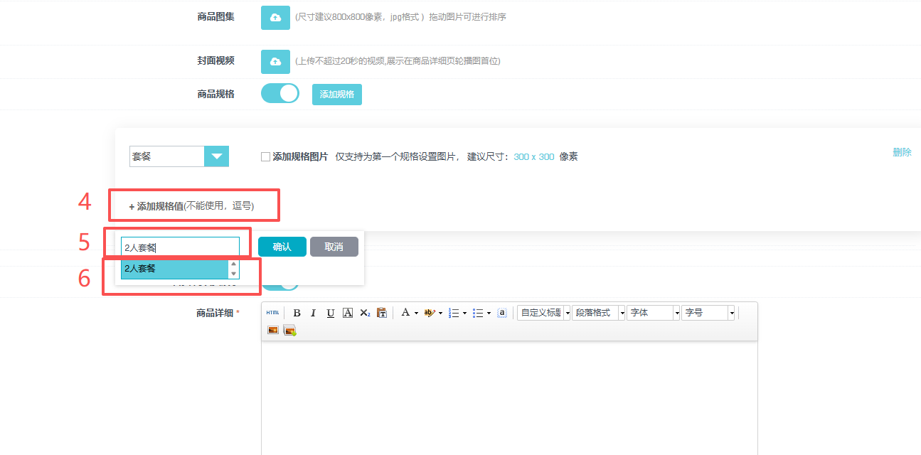 第二步:如图依次操作:4、点添加规格值,5、输入规格值,6、点击选中规格值: