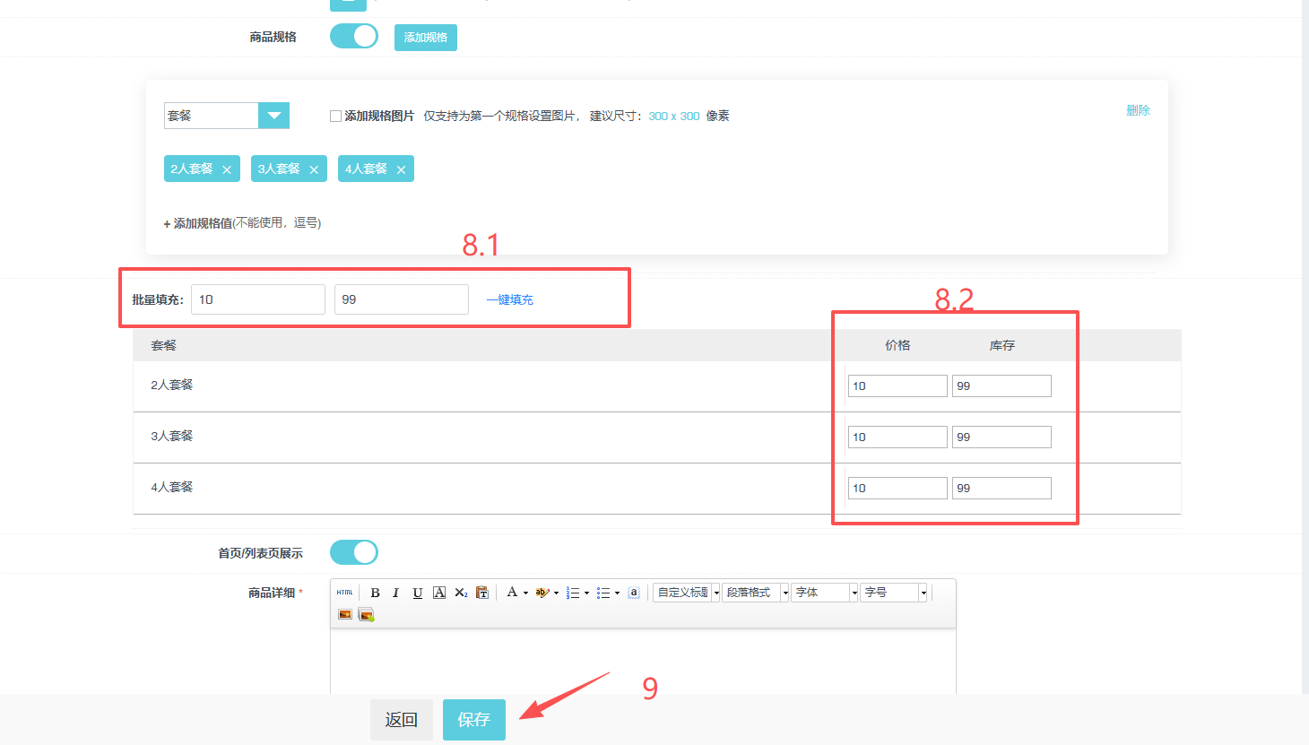 通过上一步已经添加好一个“套餐”规格 了(如果还要再添加一个规格可以按第一步中2 点“添加规格”按钮),接下来给各规格值输入价格和库存,如下图示:8.1 是批量填充, 8.2 可以单独修改填充,填写好后,9、点 保存 商品 就可以了: