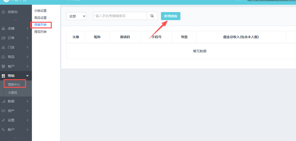 第一步,登录(www.muyu007.cn ) 木鱼小铺后台/分销/营销 中心/分销/ 微客列表,点“新增微客”,如图: