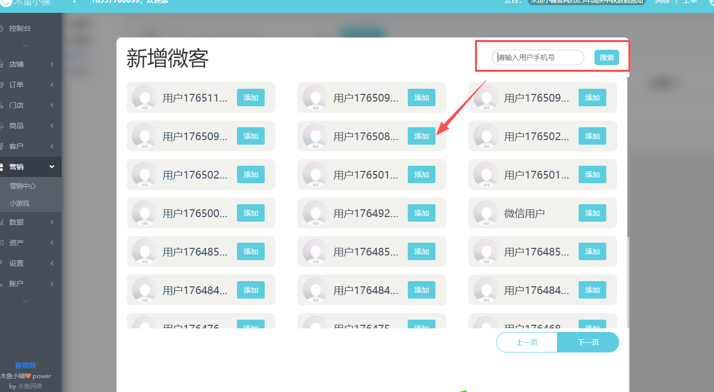 第二步:找到用户后点“添加”,或输入用户手机号搜索后添加,如图: