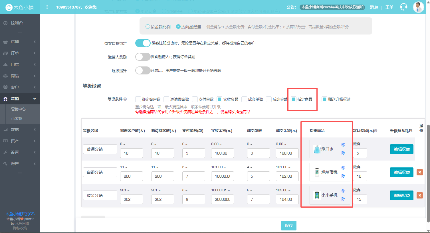 第一步:在后台/分销规则设置中,勾选指定商品,如图示: