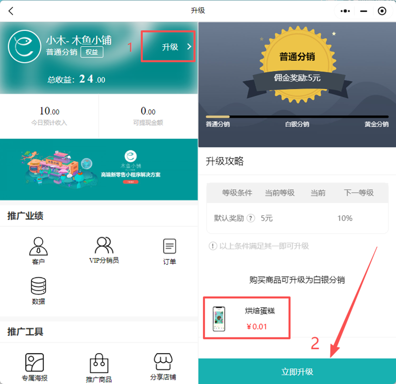 第三步:用户登录分销中心,点右上角的“升级” 然后通过购买商品的方式升级到下一个分销等级。下单升级时使用上一步派发的优惠券0元下单即可,如图示:
