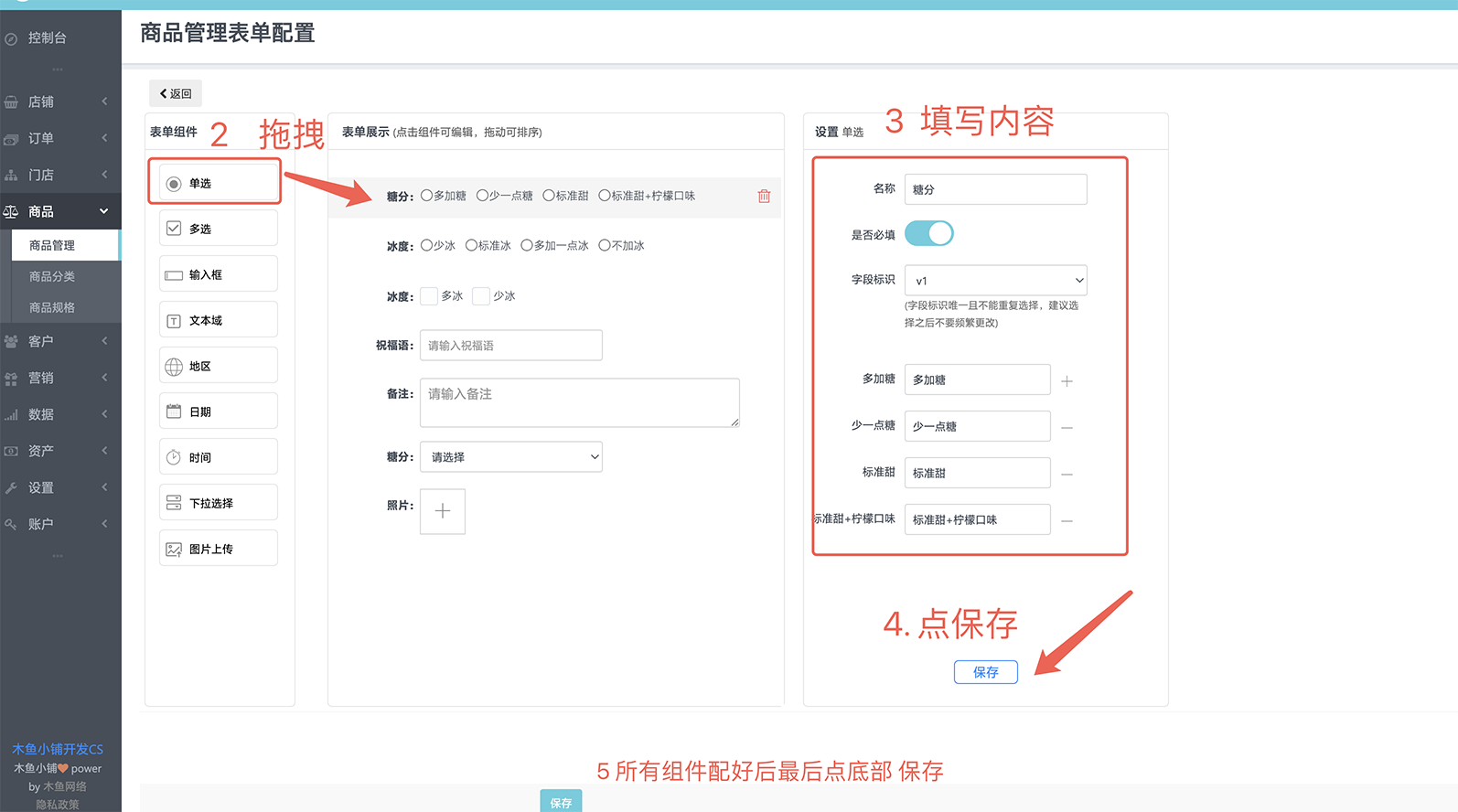 前言:商品自定义表单,是指在用户下单时需要填写或选择预先设置的留言选项,是商品规格功能的有力补充。如订蛋糕时需要填写生日祝福语、下单时备注口味等。