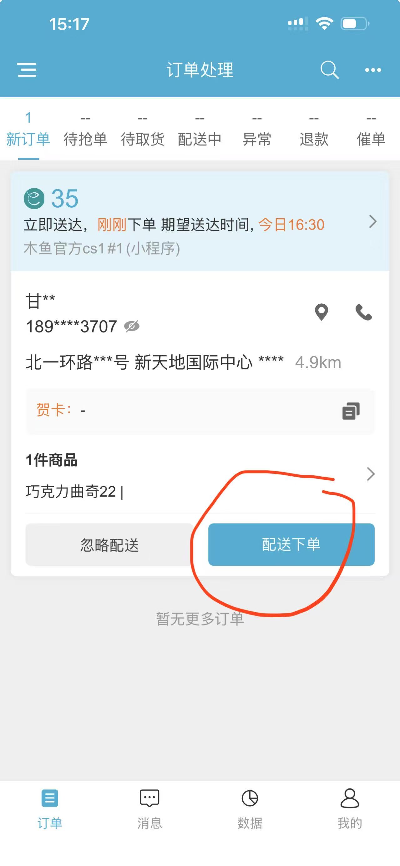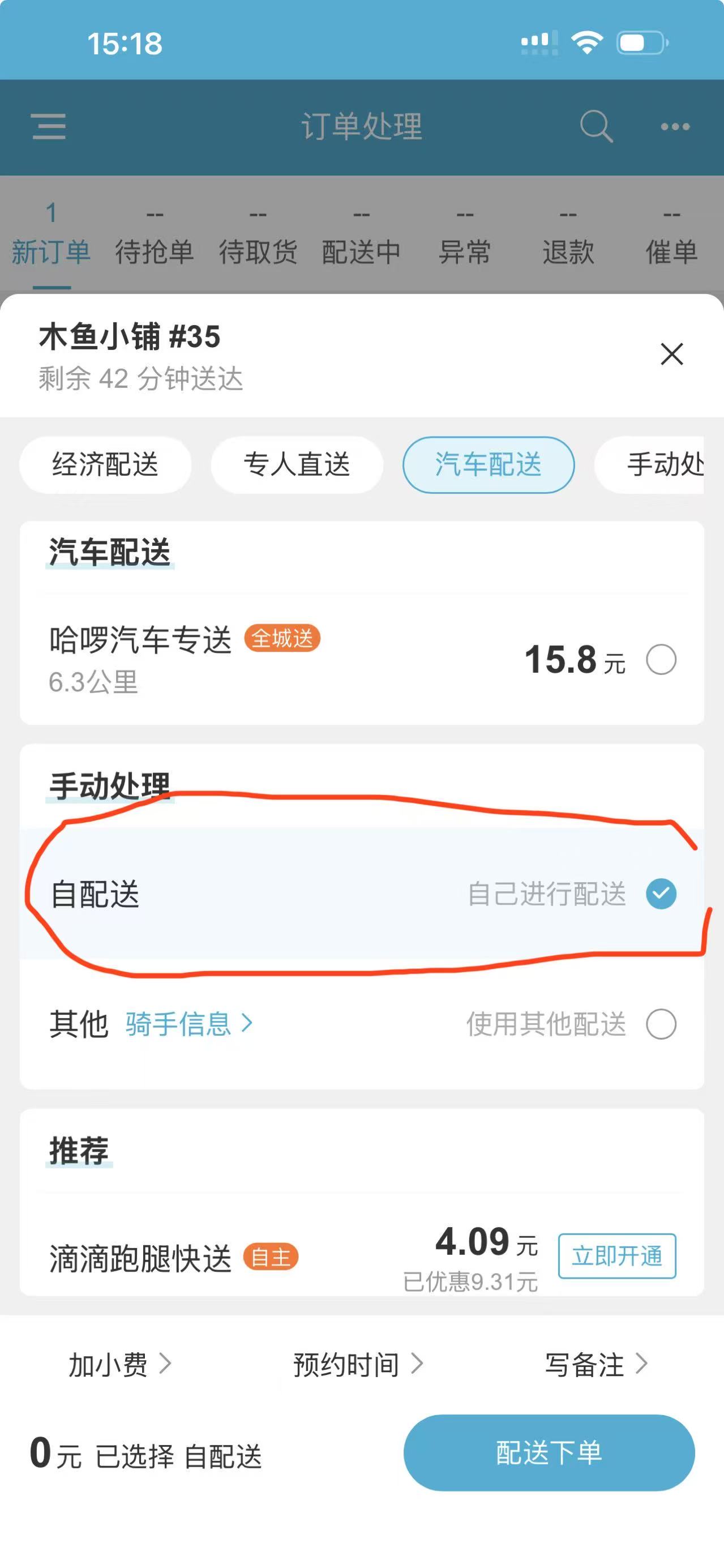 小程序上有新的外卖订单了,如何手动配送发单?操作流程如下: