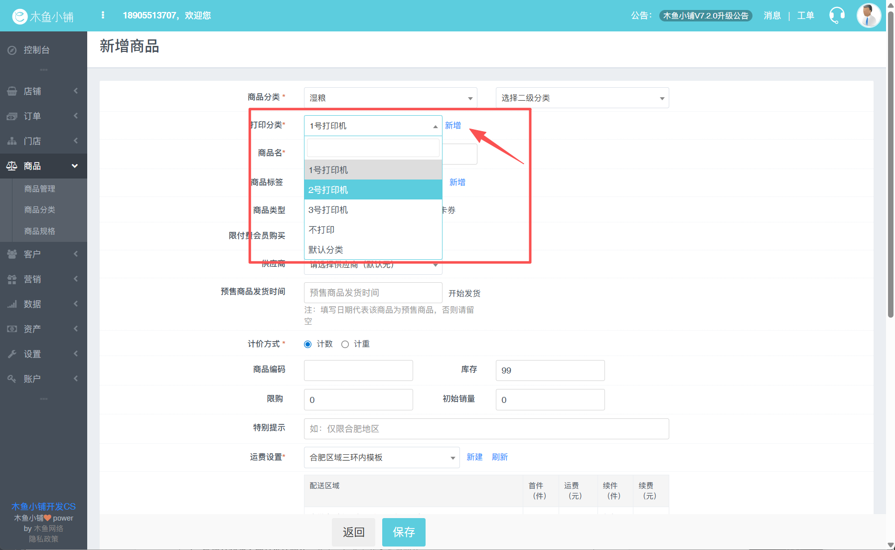 1、先在发布商品的编辑页中,新增打印分类,如下图示, 这样就可以给具体某个商品指定打印分类: