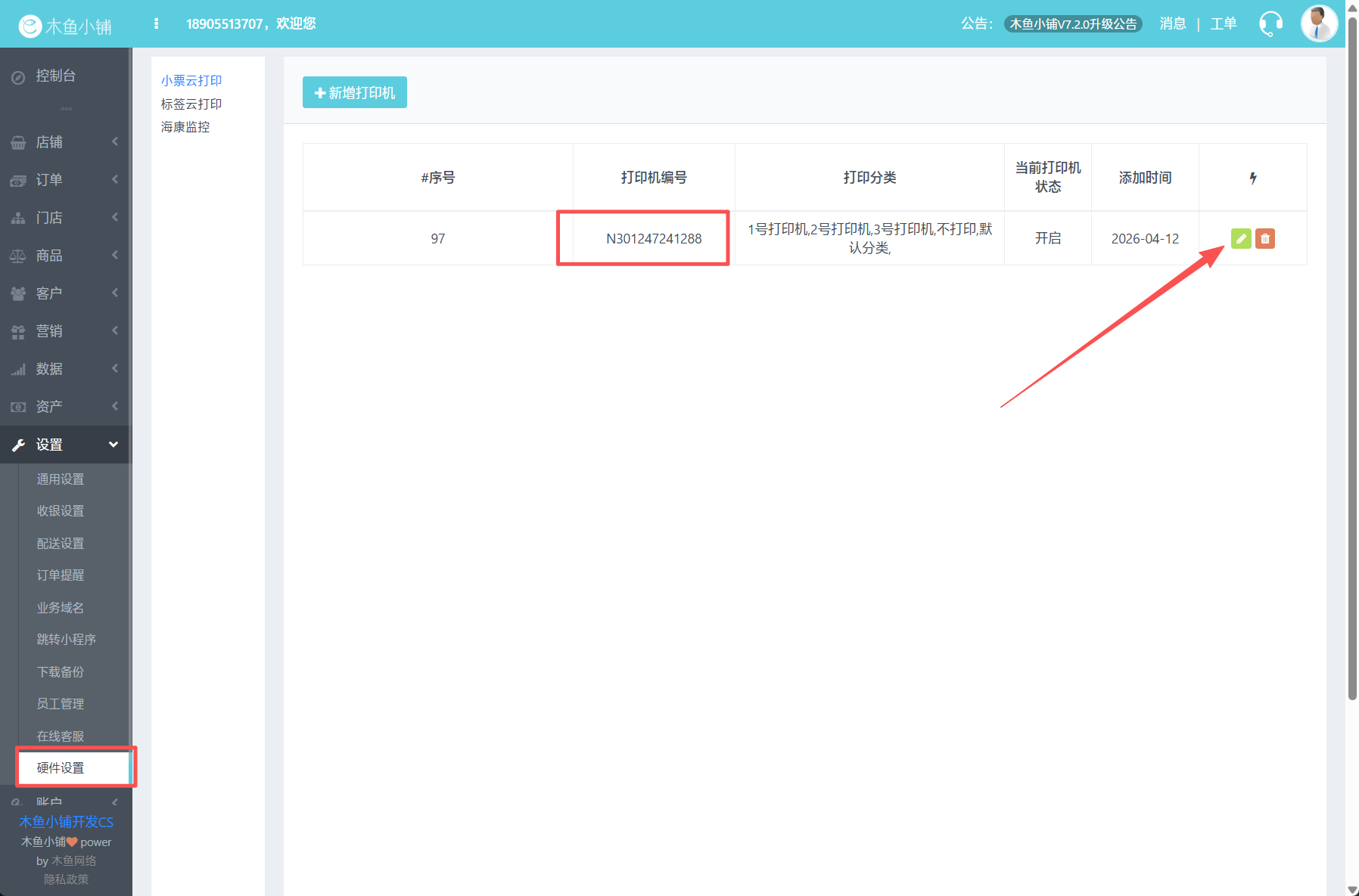 2、在后台/设置/硬件设置中,找到对应的打印机编号,点右侧绿色编辑按钮: