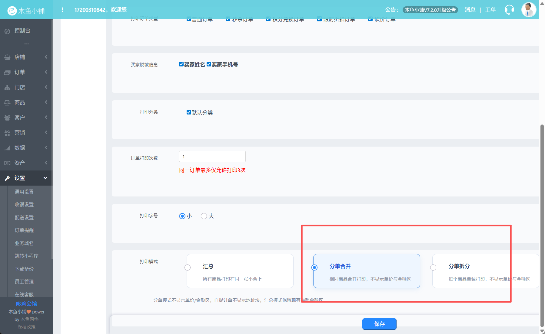 1、在后台/设置/硬件设置中,找到对应的打印机编号,进入编辑页,可以勾选分单打印: