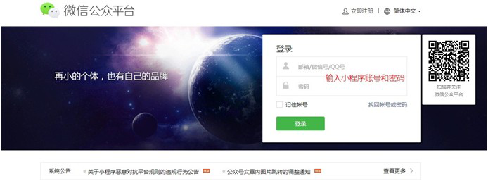 首先访问微信小程序管理后台,输入小程序账号和密码,进入小程序管理后台,如图所示: