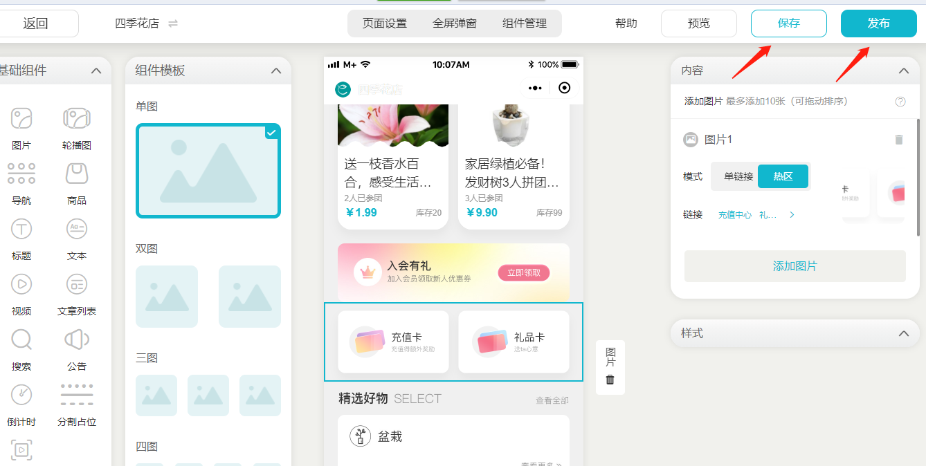 2、选择单一张图片插入装修页面,单击后右侧出现内容设置区;
